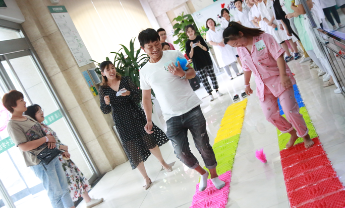 活动开始前,工作人员根据报名人员进行分组,大家按照组队参与游戏环节。踩指压板,大家主动脱去鞋袜,虽然脚底的疼痛让他们不禁喊了出来,但依然满面笑容坚持走完!“走指压板可以疏通经络,调节气血,促进新陈代谢。”一名护士为鼓励队友,将走指压板的好处脱口而出,这么一个小小的细节就可以发现我们医护人员的知识储备是非常充足的……