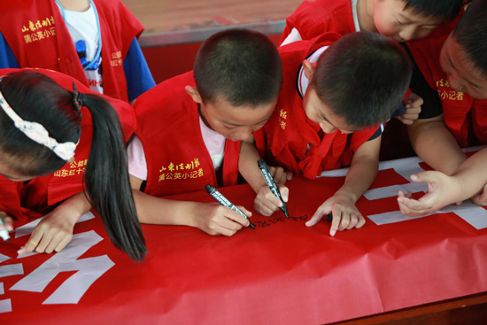 蒲公英小记者在“健康人生、绿色无毒”横幅上签名